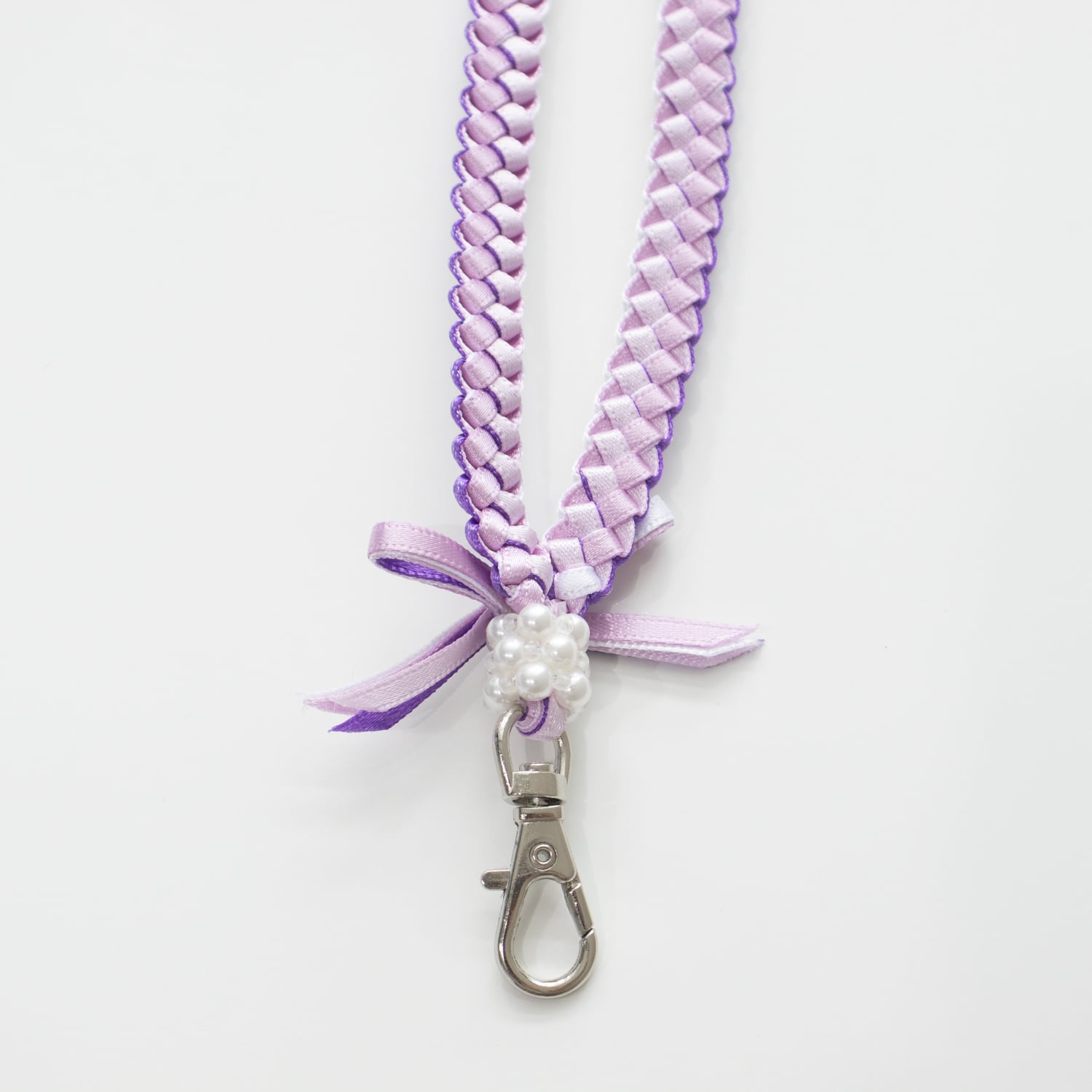 サテンリボンを手で丁寧に編み込んで制作されるネックストラップです。